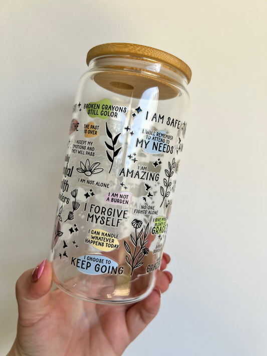 Daily Mental Health Reminders - Bamboo Lid - 16oz Glass Libbey Cup