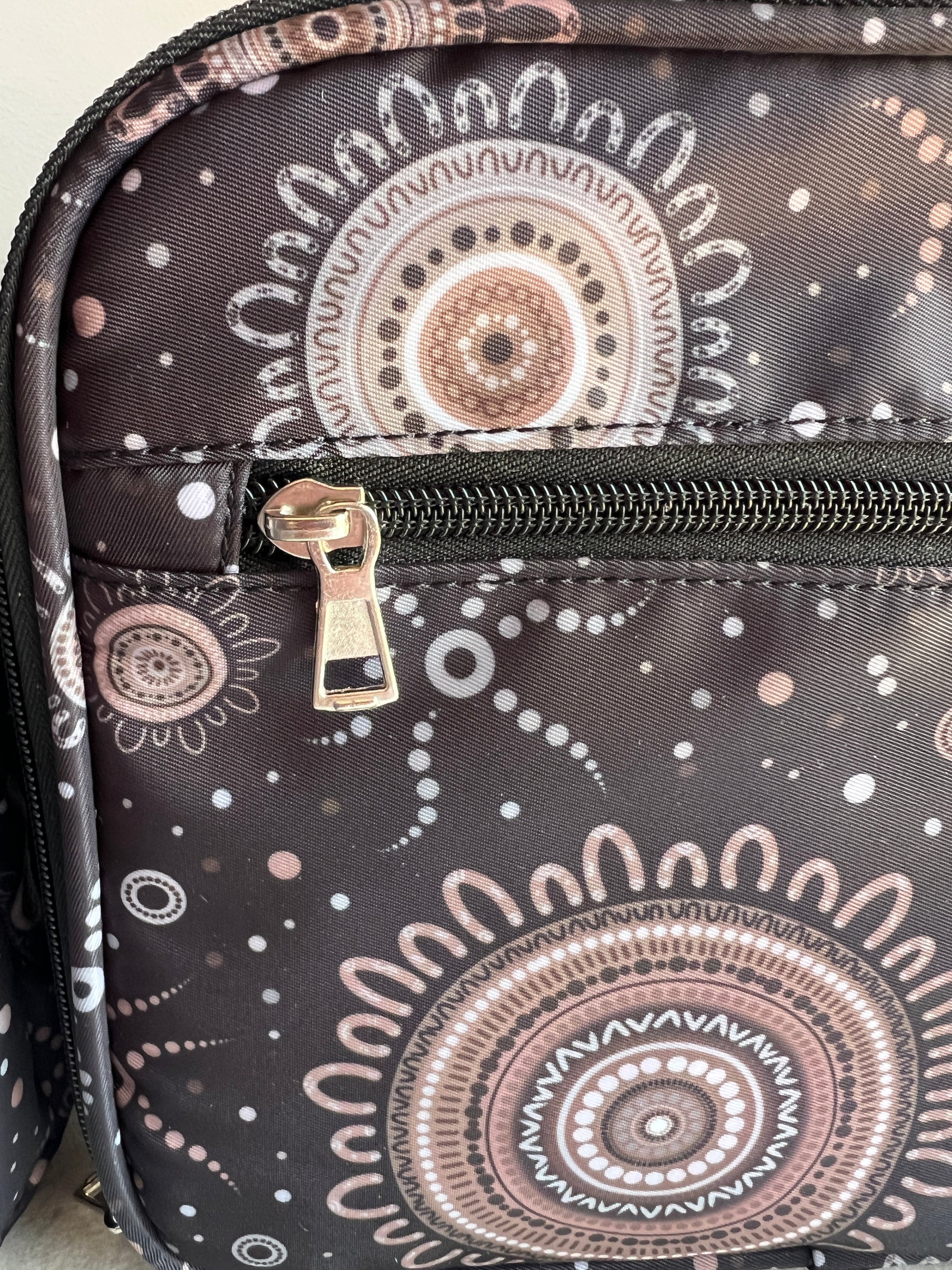 A durable, practical and beautifully designed school set made from waterproof twill polyester and printed with Danielle’s original Aboriginal artwork. This matching bundle includes a spacious backpack, insulated lunch bag and pencil case. Perfect for school, daycare, kindy and everyday adventures. Add the matching water bottle to complete the set. Limited stock available.